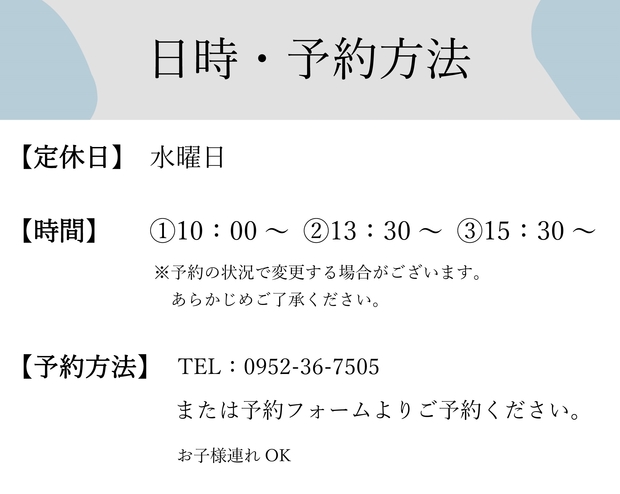 ※カレンダー機能に不具合が生じている場合は、お問い合わせフォームまたはお電話にてご予約お願いいたします。